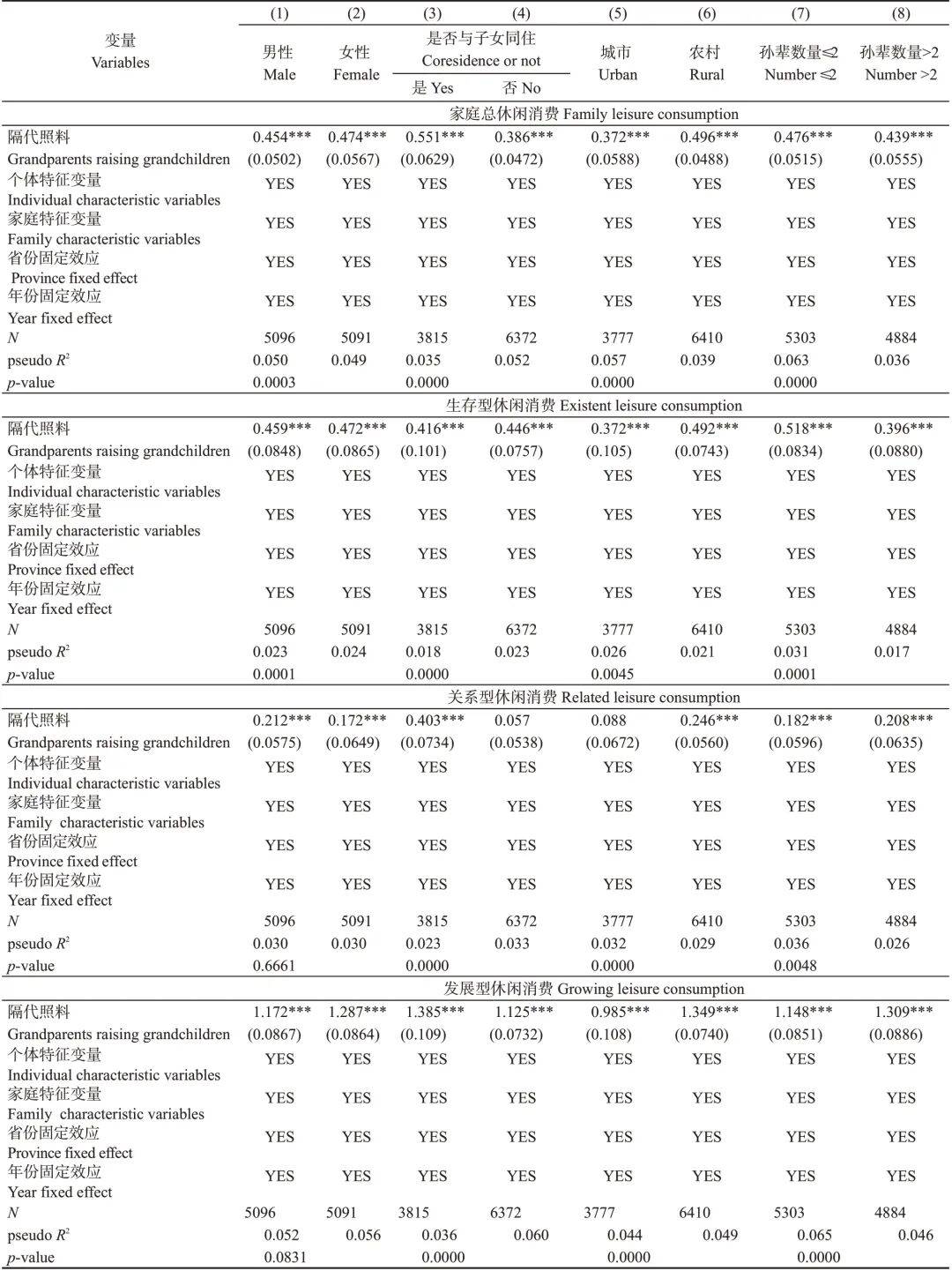 值查验、回归成果不存正在显著差别外,其余两个分项成果均具有统计意义,且结论取总体休闲消费分歧。正在我国保守“男从外、女从内”的家庭分工模式下,女性虽然比男性面对更多的休闲束缚,但老年女性做为隔代照顾的次要承担者,家庭内部的各类支撑收集更可能向其倾斜[21],从而使其具有更多的资本和能力开展休闲消费。表4 按性别、取后代同住、城乡类型、孙辈数量的分样本回归成果?。