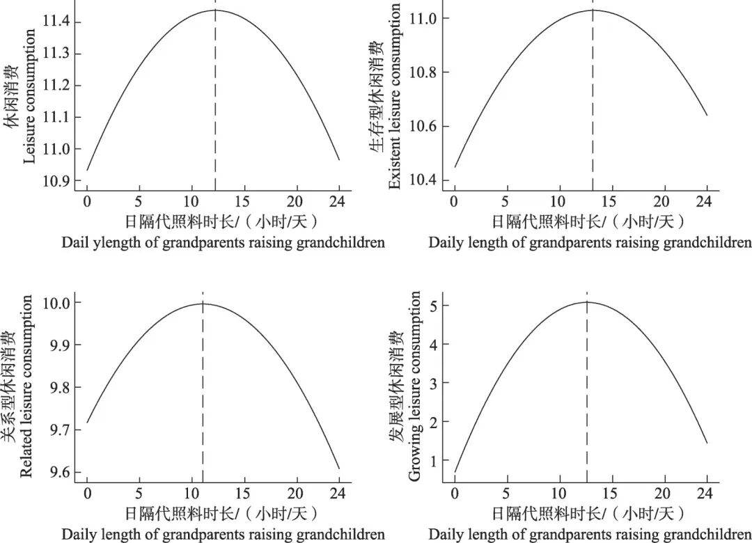 表3 第(5)~第(8)列平分别插手了隔代照顾时长取隔代照顾时长的平方,成果表白,隔代照顾时长的平方取休闲消费显著负相关,该成果申明隔代照顾取老年群体休闲消费之间呈现出倒U形的曲线关系,此中,总休闲消费及其3个分项的拐点别离为12。2小时、13。2小时、11小时和12。6小时,表白休闲消费程度正在该点处达到最大值,随后呈现下降态势(图2)。