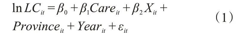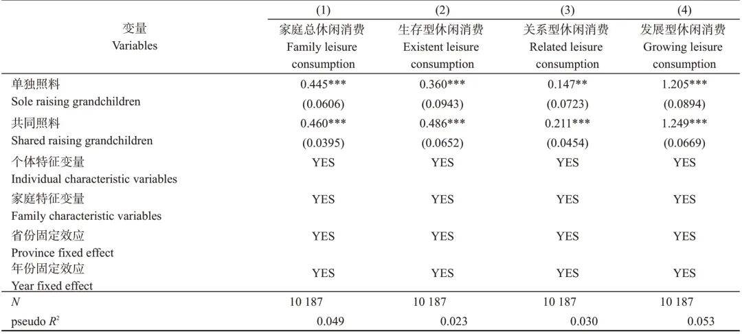 it是受访者i正在t年的各项休闲消费金额及年休闲消费总量;Careit是隔代照顾变量,暗示受访者i正在t年的隔代照顾环境;Xit是节制变量,包罗个别特征(性别、春秋、受教育程度、婚姻情况、城乡类型、自评健康、能否加入医疗安全、能否参领根基养老金)和家庭特征(家庭收入、取后代同住);Provinceit和Yearit别离暗示省份固定效应和年份固定效应;εit是回归方程的随机扰动项,β0、β1和β2是待估量的参数。3 阐发3。1 基准回归。