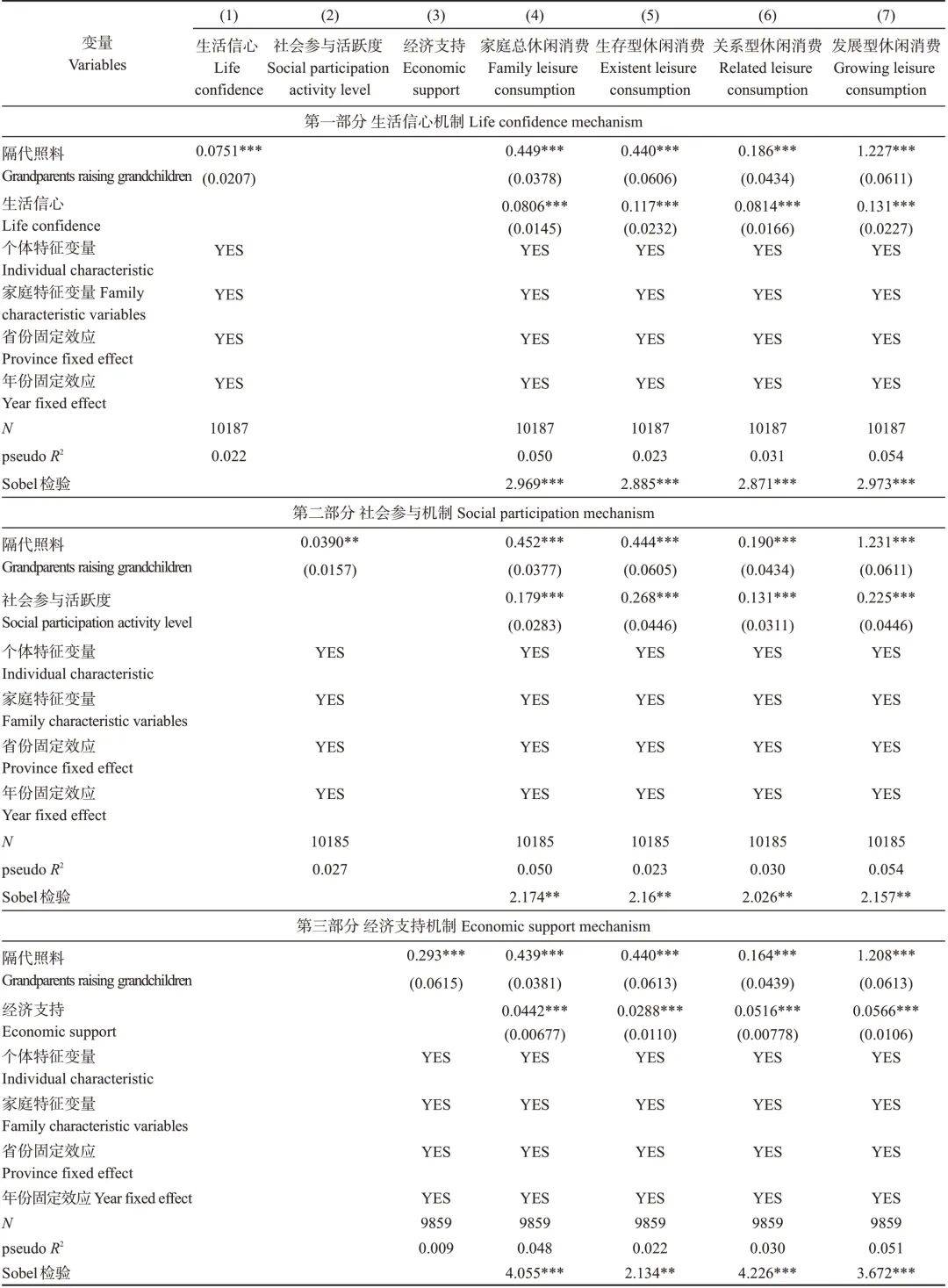 ,以全面权衡老年人的社会参取程度。对变量进行1%的缩尾处置,以消弭极端值对成果的影响,表7中第二部门显示了社会参取机制的查验成果。第(2)列查验了隔代照顾对老年人社会参取的正向影响,第(4)~第(7)列报告请示了社会参取活跃度对各项休闲消费的正向影响。此中,社会参取活跃度每添加1个单元,家庭总休闲消费添加17。9%,并正在1%的统计程度上显著,同时隔代照顾系数有所降低,证了然社会参取的部门中介感化。Sobel查验统计量均正在5%程度上显著为正,进一步验证了社会参取活跃度具有正向中介效应。火伴离世是老年群体正在晚年面对的最主要的休闲束缚之一[45],其意味着老年人原有社交收集的取休闲火伴的,降低了老年人休闲参取的动力和能力。隔代照顾正在必然程度上可以或许缓解这一束缚。通过照顾孙后代,老年人可以或许接触分歧类型的社会群体,修补和更新其日渐萎缩的社交收集,从而获得新的休闲参取火伴和休闲消费消息,提拔其休闲消费程度。3。4。3 经济支撑机制本文拔取后代对老年人的经济支撑做为布局性束缚假设的代办署理变量。按照受访者对CHARLS问卷中“过去一年,正在后代不和您住正在一路时,您或您的配头从后代那里收到过几多经济支撑”的回覆,建立老年人经济支撑变量,并取对数?。