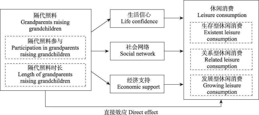 [18,55],进而添加了休闲消费的时间束缚,对休闲消费程度的提高发生限制。此外,适度劳动理论认为,当个别劳动投入量过度时,会发生心理或心理压力,二者随时间堆集,并最终损害个别健康。已有研究表白,照顾孙辈的强度取祖辈效用后果之间是一种非线],过度参取隔代照顾会对老年人身体和健康形成损害,而仅供给辅帮照顾对祖辈的消沉感化似乎较小[56]。近期对中国的研究也获得类似的结论[18],其缘由可能正在于,供给高强度照顾的老年人,凡是承担着更高的脚色期望和义务要求,而不竭堆集的压力和持久的身体怠倦会对其健康发生负面影响[57]。对老年群体而言,健康情况是影响其休闲消费参取的环节要素,高强度的隔代照顾可能使其健康情况恶化,加强布局性束缚,进而限制休闲消费程度的提高。综上,本文基于条理休闲限制理论,从个别、人际和布局性限制3个维度,切磋隔代照顾对老年群体休闲消费的影响机制。具体表示为,恰当的隔代照顾不只可以或许提拔老年人的糊口对劲度,激励糊口决心,为开展休闲消费勾当供给内活泼力;还可以或许拓宽老年人的社会收集,提高其可安排收入,令老年人更为成功地参取休闲勾当。但同时,高强度的隔代照顾也会挤占老年人闲暇时间,并对其健康情况形成影响,进而晦气于休闲消费程度的提高。基于此,本文提出如下假设:隔代照顾通过加强老年人糊口决心、拓宽社会收集以及添加后代对其的经济支撑,缓解其个别、人际和布局性限制,以提高老年休闲消费程度;但高强度的隔代照顾也可能障碍休闲消费程度的提拔。本文连系休闲限制理论,提炼出“隔代照顾-休闲消费”之间关系的理论模子(图1),阐发了隔代照顾对老年休闲消费影响的间接效应取径机制。按照该模子,隔代照顾能够无效提高老年休闲消费程度,糊口决心、社会收集和经济支撑正在两者的关系中起到中介感化。
