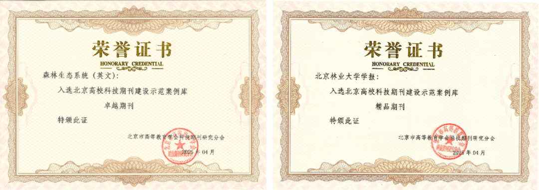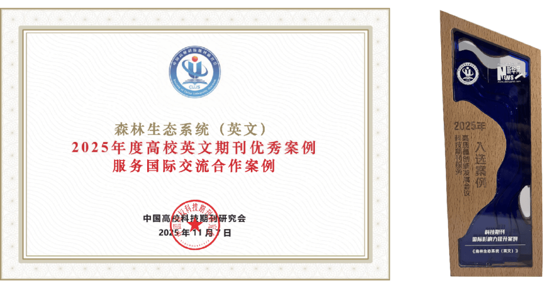 《Forest Ecosystems》入选“2025年度高校英文期刊办事国际交换合做优良案例”,同时获评新华网取中国高校科技期刊研究会结合颁布的“2025年科技期刊国际影响力提拔”案例。正在高校科技期刊扶植示范案例库评选中,《Forest Ecosystems》入选“杰出期刊”,《林业大学学报》入选“精品期刊”,彰显了刊物正在学术质量取办刊程度上的双沉劣势。